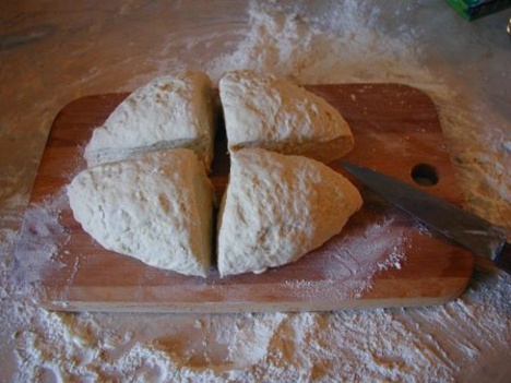 Тесто делим на 4 части и раскатываем толстой лепешкой (1см), нарезаем ромбиками со сторонами примерно 3-4 см.