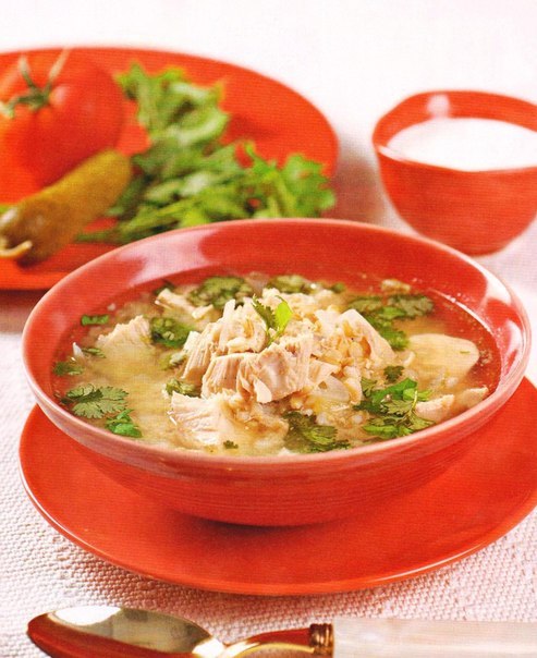 6. В маленькой миске растереть желтки, влить в них 2-3 ст. л. бульона и добавить в суп. Размешать, разлить по тарелкам, посыпать зеленью кинзы и подать к столу.