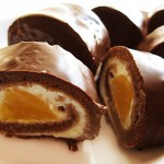 Блинчики в шоколаде с творожной начинкой и персиком.