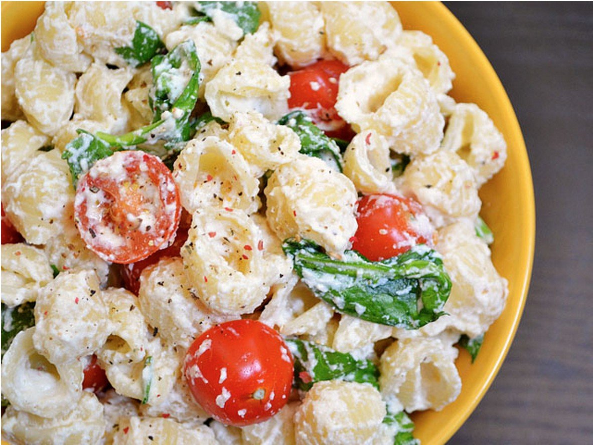 Промойте готовую пасту, слейте воду и добавьте в еще горячую кастрюлю с пастой томаты, шпинат и соус.