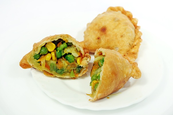 3. Поставьте большую сковороду на средний огонь и поджарьте семена кумина и шамбалы в 2 ст. л. топленого или растительного масла. Когда они начнут темнеть, добавьте к ним натертый имбирь и молотые пряности и жарьте еще несколько секунд. Положите кубики картофеля и, помешивая, жарьте 3-4 мин, затем добавьте цветную капусту. Жарьте, помешивая, еще 3-4 мин. Добавьте 2 ст. ложки воды, накройте крышкой и варите 15 мин, пока овощи не станут мягкими (следите, чтобы они не пригорели). Добавьте горошек, приправьте солью и черным перцем, затем выложите начинку на чистое блюдо, чтобы она остыла, пока вы раскатываете тесто.