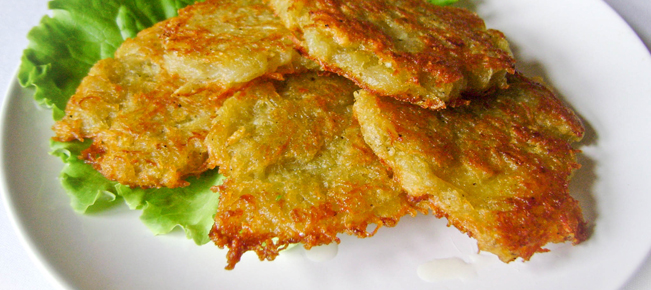 Картошка не темнеет и будет еще более хрустящей, если опустить ее сразу после терки в миску с холодной водой, дать постоять минут 10, затем воду слить, картошку завернуть в чистое кухонное полотенце и крепко-накрепко отжать.