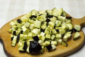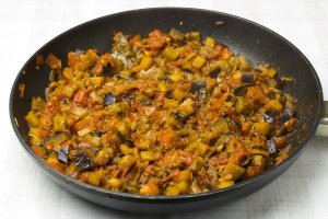 Чтобы приготовить постную пасту возьмите: 1 крупный баклажан, 400 грамм спагетти, 3 помидора, 1 морковь, 2-3 головки репчатого лука, 2 зубчика чеснока, сухой орегано, розмарин, тимьян, соль и перец.