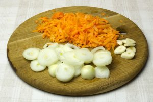Морковь натереть на крупной тёрке. Лук нарезать кольцами или полукольцами. Чеснок крупно порубить.