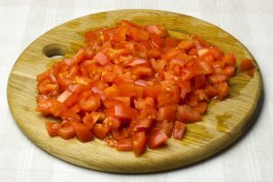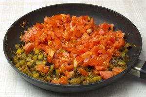 В сковороду выложить помидоры, увеличить огонь и хорошенько прожарить 3-5 минут. Затем убавить огонь до минимума и тушить подливку 10-15 минут.