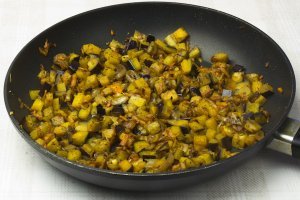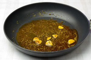 Немного разогрейте сковороду и добавьте оливковое масло. Через 1 минуту добавьте специи и чеснок. Обжаривать 2 минуты.
