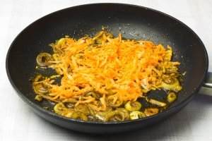 В сковороду добавить лук и жарить 3 минуты. Затем добавить морковь. Овощи обжаривать 2-3 минуты.