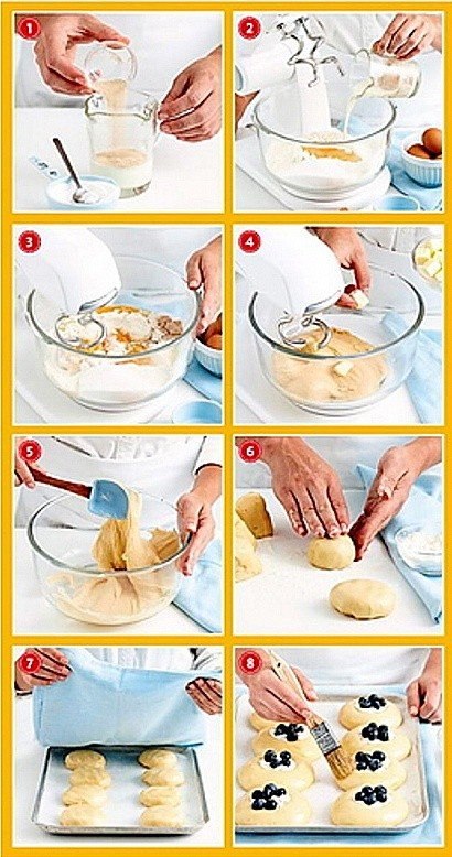 8. Прогрейте духовку до 180ºС (средняя мощность). В середину каждой булочки выложите ложкой 2 ч.л. рикотты, а сверху ягоды, вдавливая их в рикотту. Смажьте яйцом при помощи кисточки. Посыпьте необработанным или тростниковым сахаром. Выпекайте 10 минут. Уменьшите огонь в духовке до малого (160°С) и пеките еще 10-15 минут, до золотистой корочки.